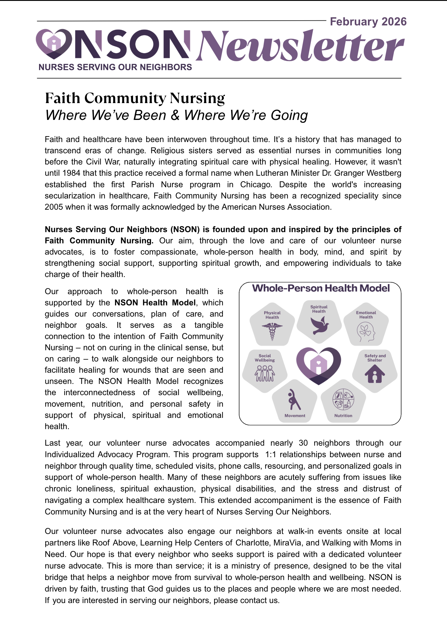 Nurses Serving Our Neighbors is a team of volunteer faith community nurse advocates who are willing to provide education, navigation, and resources to promote whole person health of body, mind, and spirit within the Charlotte community.